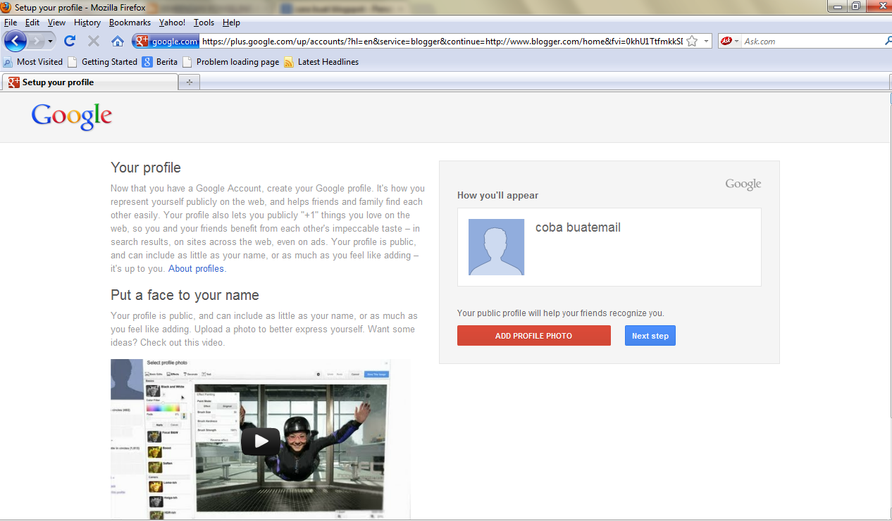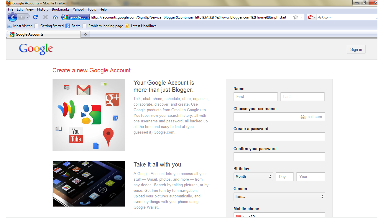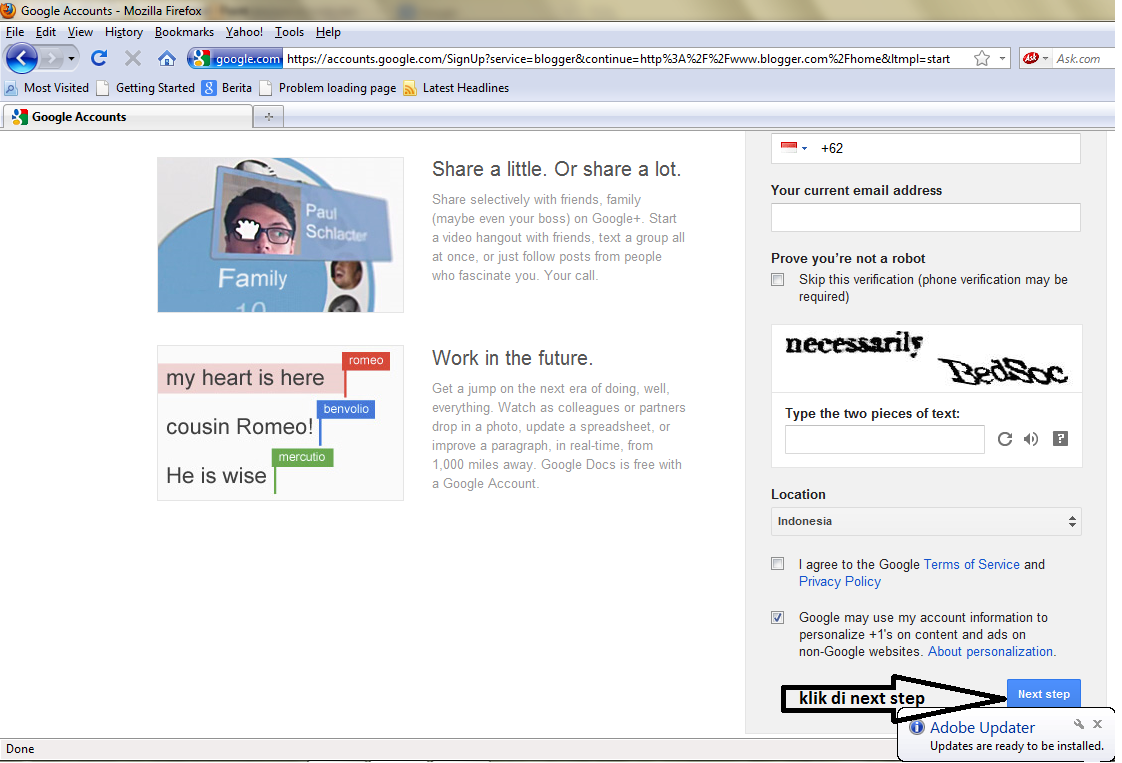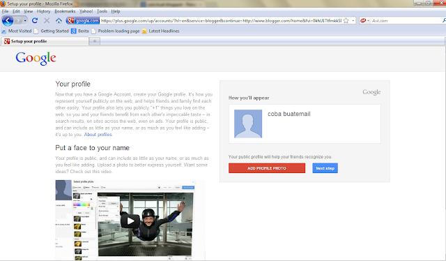 - bagi yang belum punya email gmail harus melewati tahap ini jadi bisa sekalian buat email di gmail.com lalu klik next step apabila sudah di isi semua kolom yang kosong, juga di tuliskan nomer hp yang bisa di hubungi untuk ferivikasi lewat sms ( perlu di catat nama email dan pasword anda tadi ), lalu akan tampil seperti ini ;