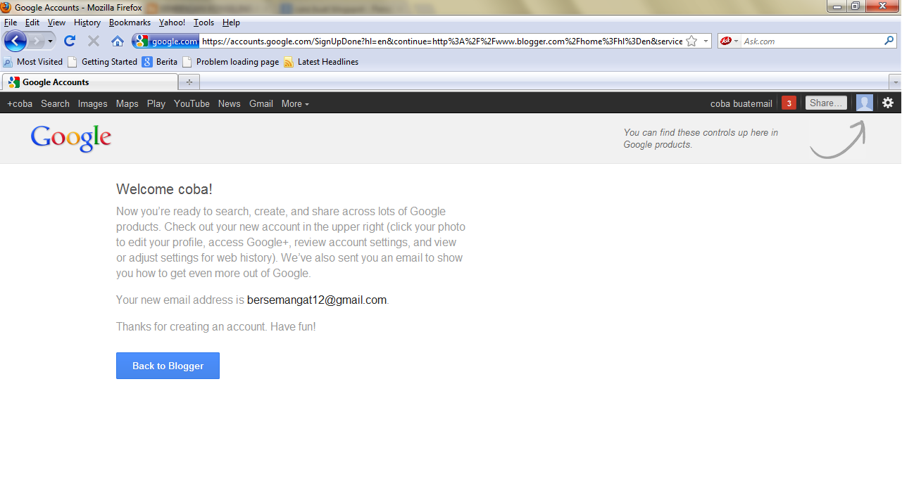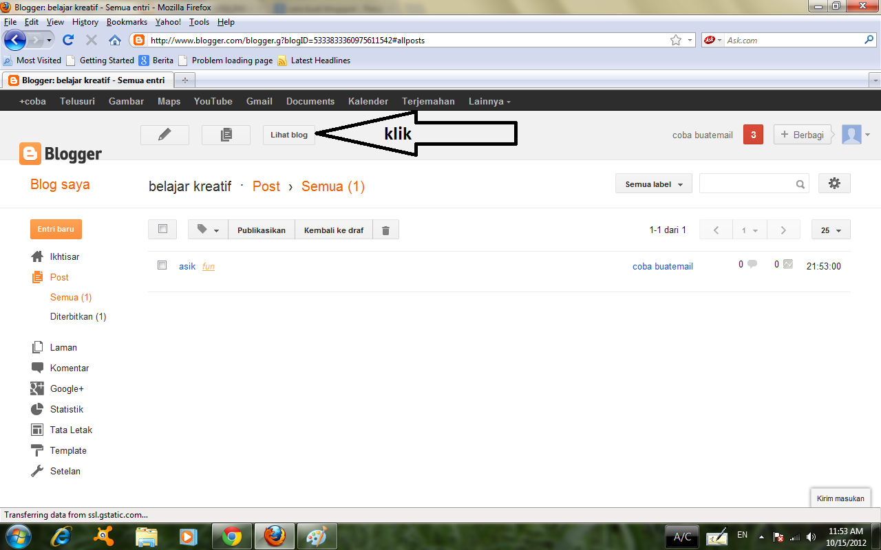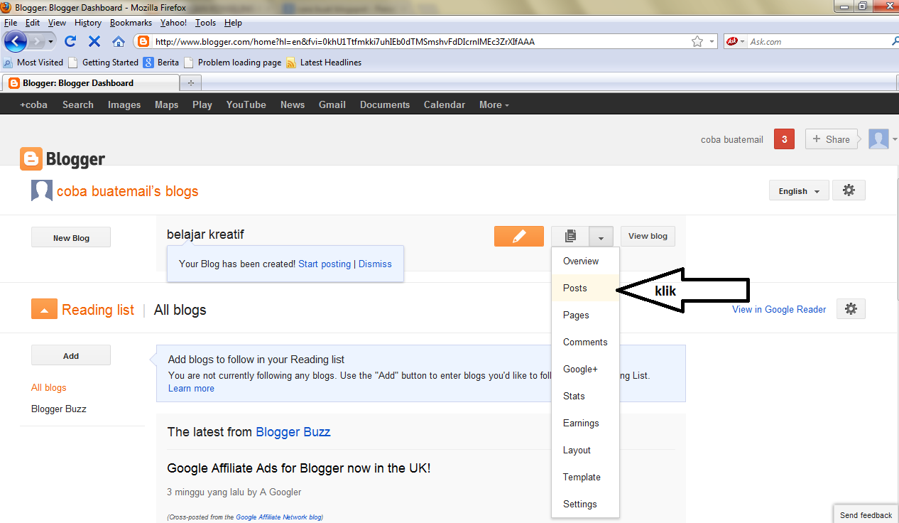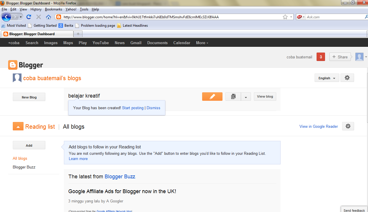 - lalu klik lihat blog dan anda sudah punya blog dan telah menerbitkan satu tulisan. ( penting catat alamat gmail dan paswordnya jangan sampai orang lain tahu, juga di catat alamat bloganda tersebut. selamat mencoba, semoga bermanfaat