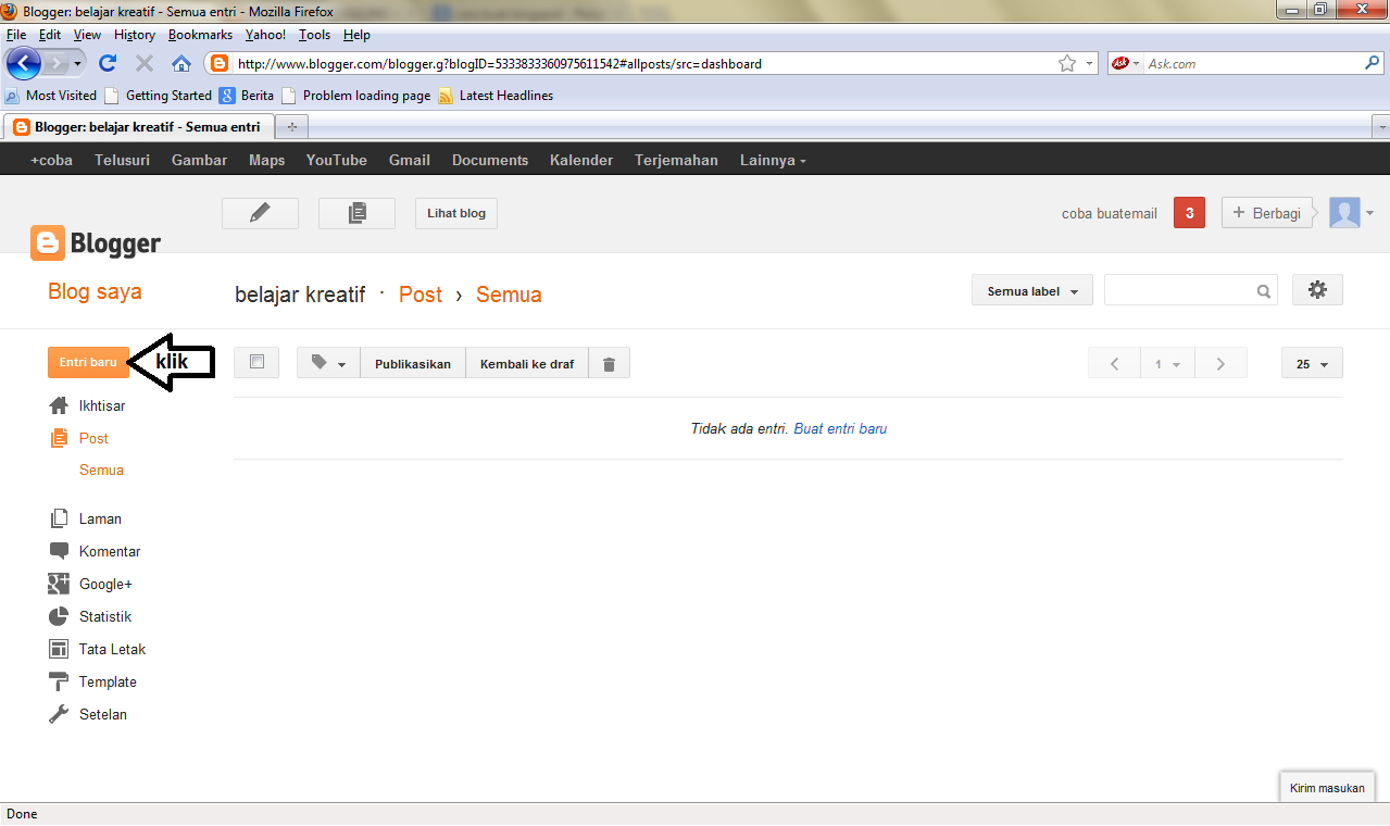 - lalu klik entri baru dan anda akan memulai membuat tulisan dan gambar di blog dan tampilannya seperti ini