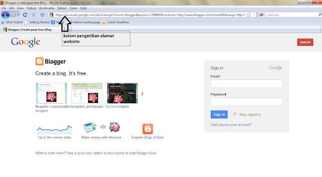 - buka program browser anda misal program Mozilla Firefox, Opera, Internet Explorer atau Google Chrome, terus klik di kolom pencarian ketikkan alamat : blogspot.com lalu akan tampil seperti seperti di bawah ini ( Penulis menggunakan Program Mozila Firefox )