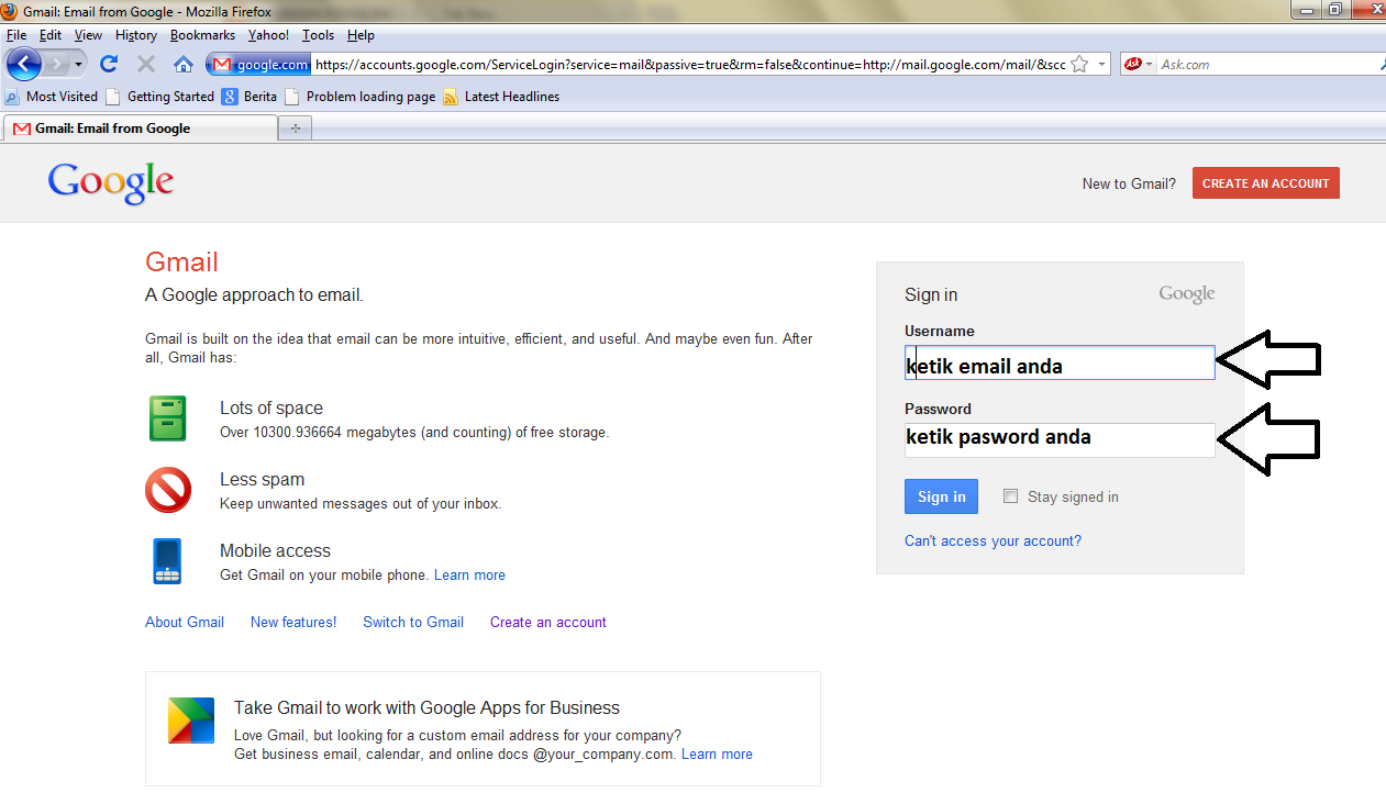 - buka program browser anda lalu ketik alamat gmail.com di kolom alamat website lalu klik kolom username dan isi dengan al.amat email anda contoh 12345@gmail.com lalu klik kolom pasword dan ketikkan pasword email anda